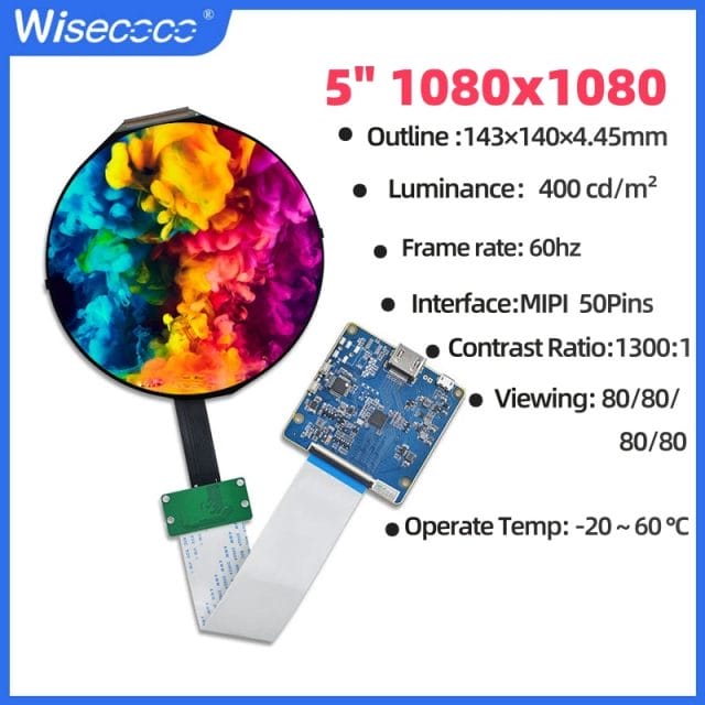 Wisecoco 5 Inch Round Screen IPS 1080×1080 Circular TFT Display For Raspberry Pi Instruments Digital Signage MIPI Driver Board
