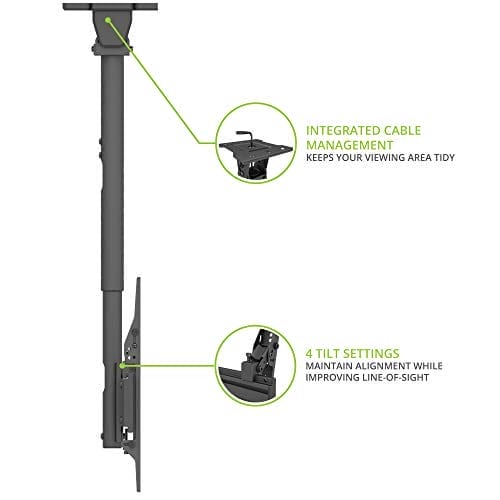 Features: Modular Design – Available in three models, MB ceiling mounts support two to four screens weighing up to 66 pounds each. Their modular design allows for additional extrusions to be added to accommodate TVs with wider VESA patterns, or to connect multiple units together., Easy Installation – To reduce strain, the MB series uses lightweight ceiling plates that are installed independent of the rest of the mounting system. Simply slide each extension pole into place and secure it to complete the installation. The ceiling plates also provide up to 90° of swing to account for sloped ceilings and support beams, or to secure the mount to a wall., Precision Leveling – Each mounting bracket allows for micro height adjustments to be made to ensure your TVs are level and perfectly aligned., Adjustable Height – The telescoping extension pole allows you to position the center of the TV mounting plate between 24.3” and 39.3” from the ceiling. For tighter spaces, remove the inner pole to achieve a distance of 12.7" to 17"., Easy Tilt – Tilt the mounting brackets 5°, 10° or 15° forward to improve line-of-sight while maintaining alignment between your screens. To compensate for potential lean, the brackets can also be angled up to 6° backward..
